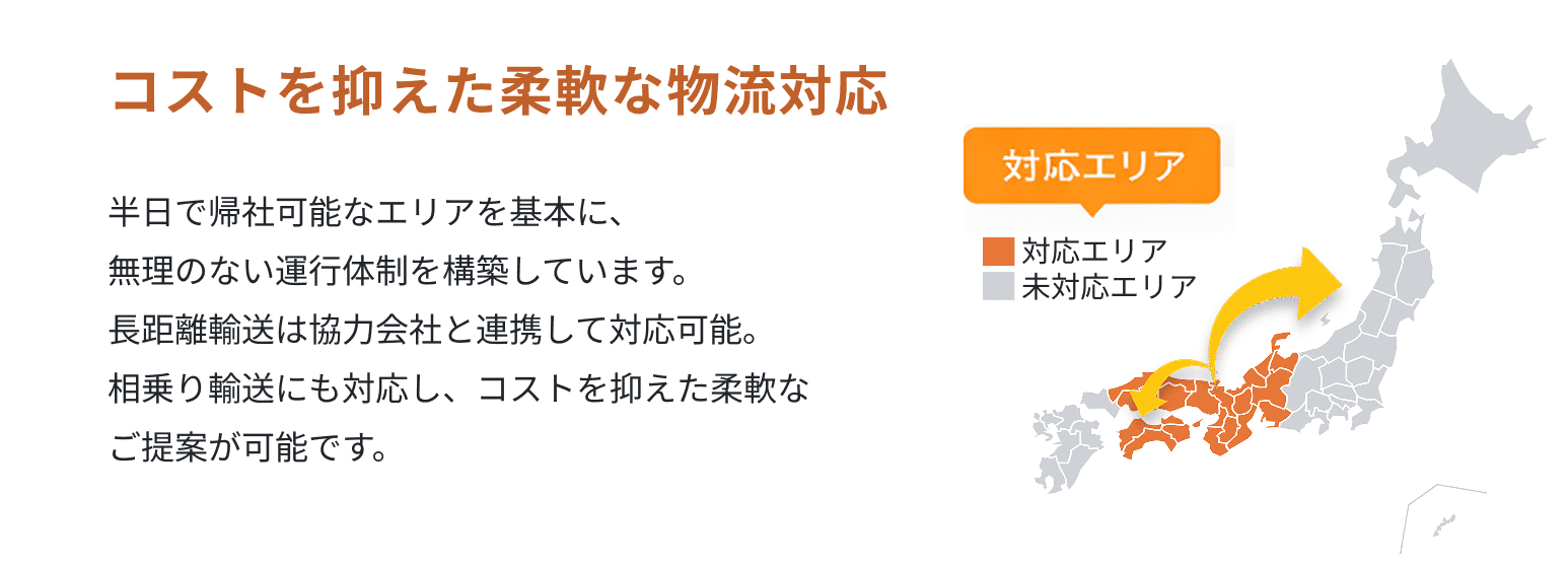 お客様のご要望にお応えするため、保管・配送まで一貫して品質と安全を大切に運用しています。大阪を拠点に、近畿圏を中心としたエリアを保有車両20台で対応。配送・集荷はもちろん、輸送条件に合わせたご提案も可能です。まずはご相談ください。